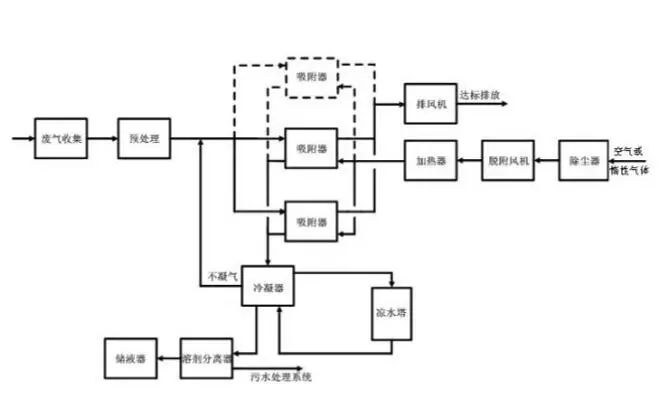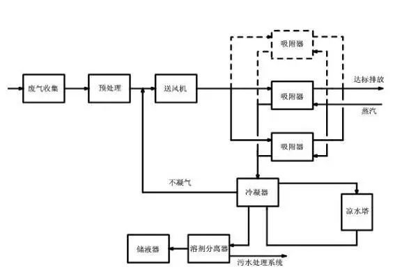 二、 當(dāng)廢氣中的有機(jī)物具有回收價(jià)值時(shí),可根據(jù)情況選擇采用水蒸氣再生、熱氣流(空氣或惰性氣體)再生工藝。脫附后產(chǎn)生的高濃度氣體可根據(jù)情況選擇采用降溫冷凝或液體吸收工藝對(duì)有機(jī)物進(jìn)行回收。