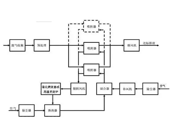 三、 當(dāng)廢氣中的有機(jī)物不宜回收時(shí),宜 采用熱氣流再生工藝。脫附產(chǎn)生的高濃度有機(jī)氣體采用催化燃燒或高溫焚燒工藝進(jìn)行銷(xiāo)毀。